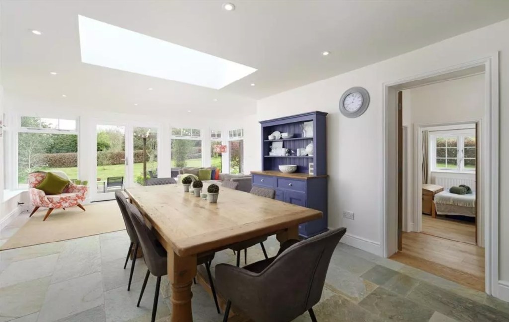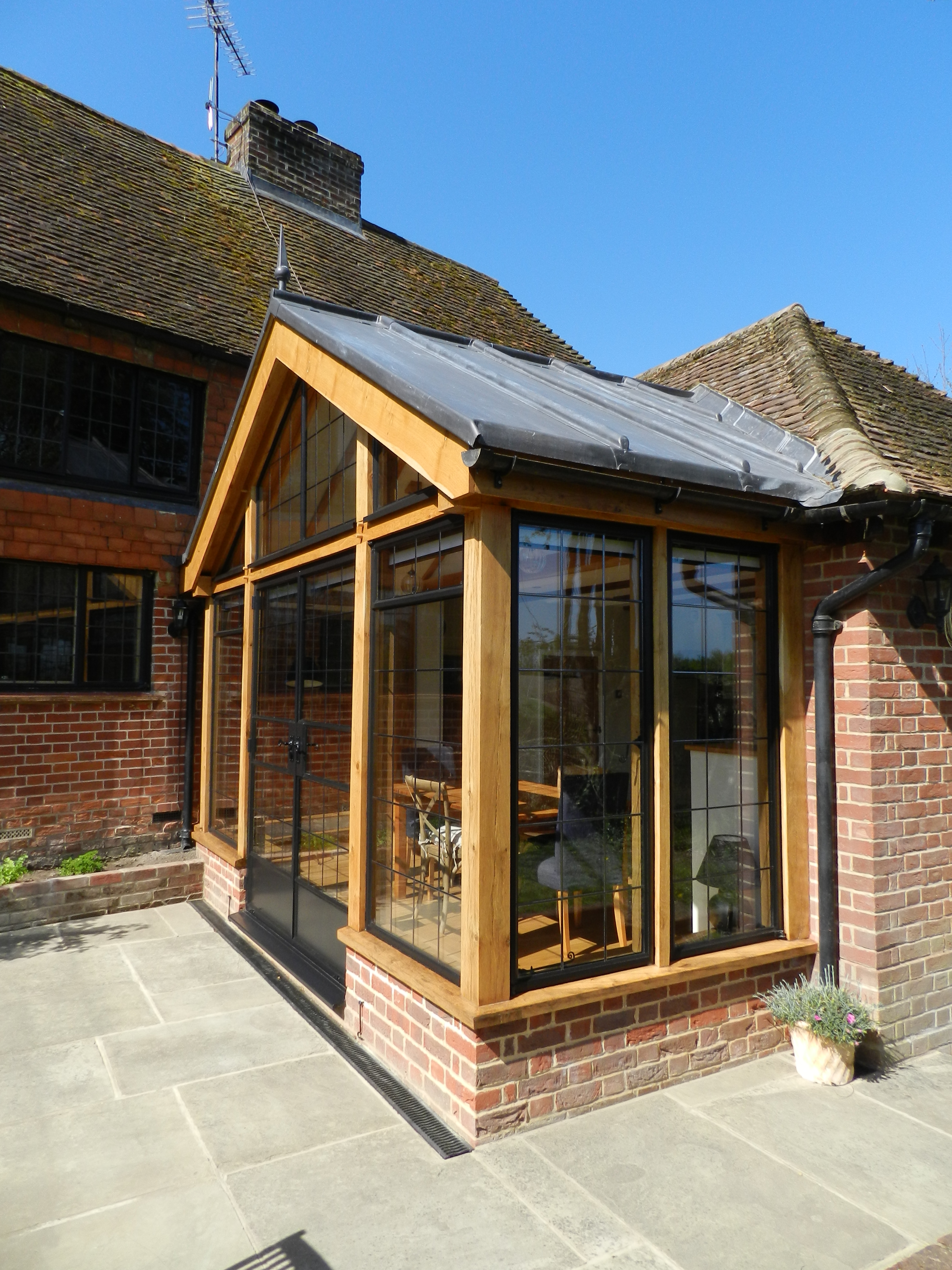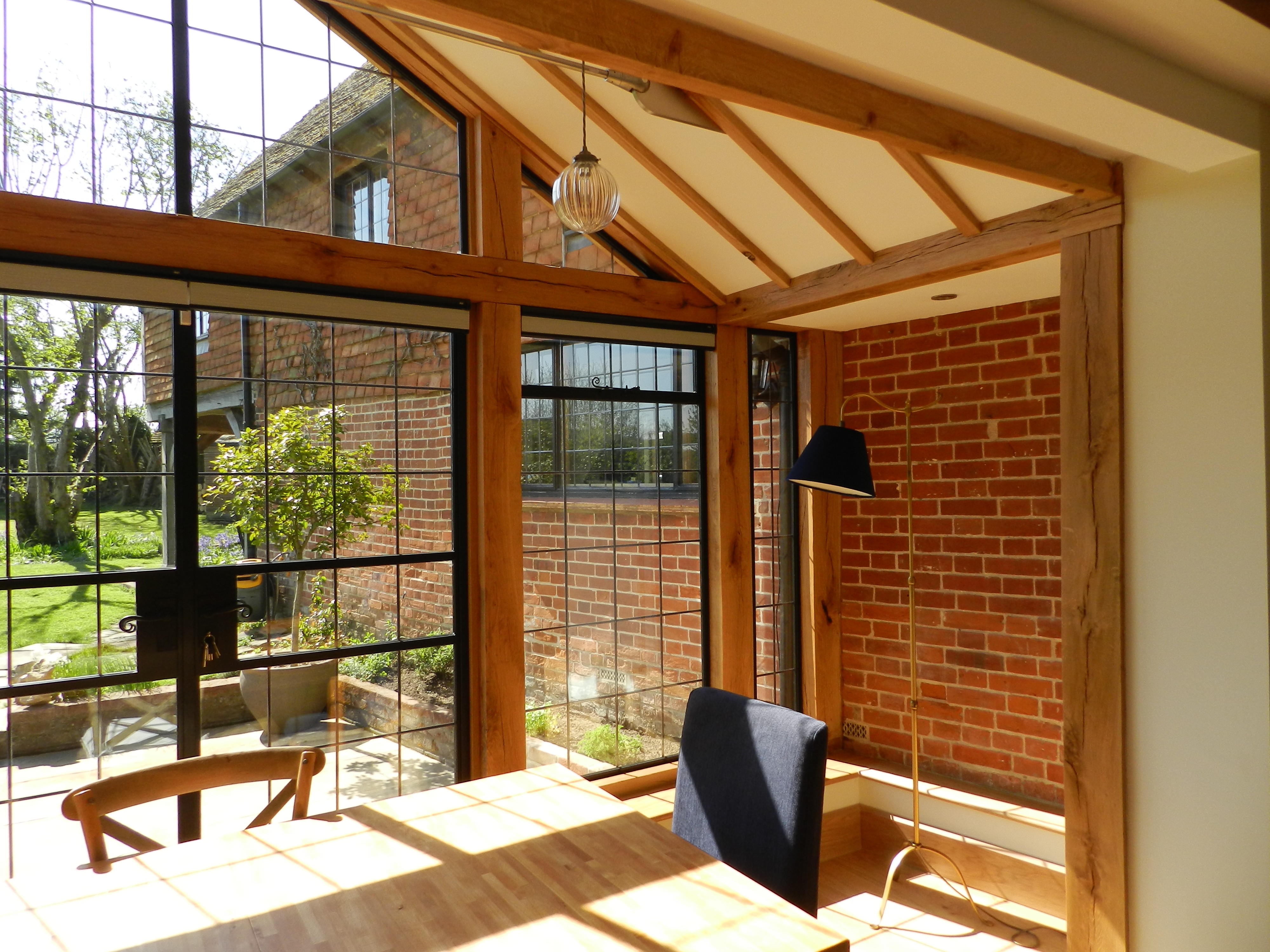 This small Oak frame extension to a Grade II Listed house transforms the Kitchen-Dining room, which now opens up to the garden and landscape beyond. Crittal-style windows and doors provide a touch of modern elegance, complimenting the traditional design.